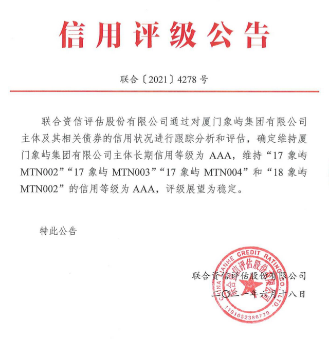 6月21日,国内权威评级机构联合资信评估股份有限公司(以下简称“联合资信”)发布厦门尊龙集团有限公司(以下简称“尊龙集团”)2021年跟踪评级报告,确定维持尊龙集团主体长期信用等级和公司债券信用等级为AAA,评级展望为稳定。